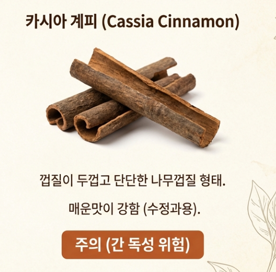 이 부분이 오늘 글에서 가장 중요해요. (진지함 😐) 계피라고 다 같은 계피가 아니거든요. 시중에 파는 계피는 크게 '실론 시나몬'과 '카시아 계피(수정과용)'로 나뉘는데, 이 둘을 구분하지 않고 먹으면 '쿠마린'이라는 성분 때문에 간 독성 위험이 있어요.
