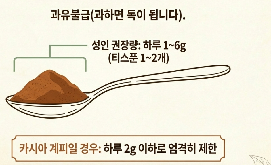 - 카시아 계피의 경우: 하루 1~2g 이하로 제한하는 것이 안전
