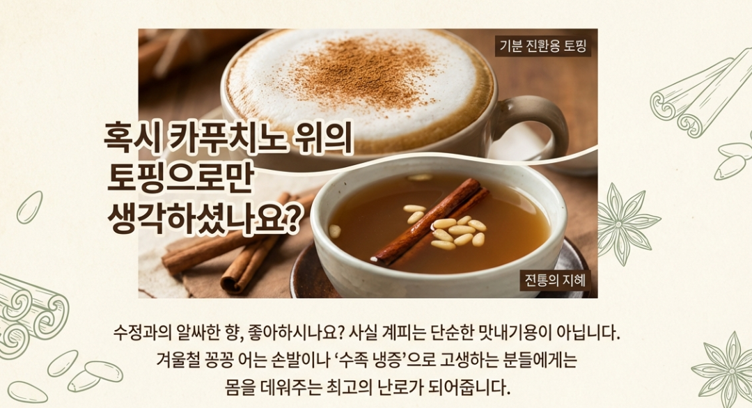 여러분, 수정과 좋아하시나요? 저는 사실 그 특유의 알싸한 향 때문에 수정과를 별로 안 좋아했는데요. 겨울만 되면 손발이 꽁꽁 어는 '수족냉증' 때문에 고생하다가, 계피가 몸을 따뜻하게 하는 데 최고라는 말을 듣고 챙겨 먹기 시작했어요. 😊