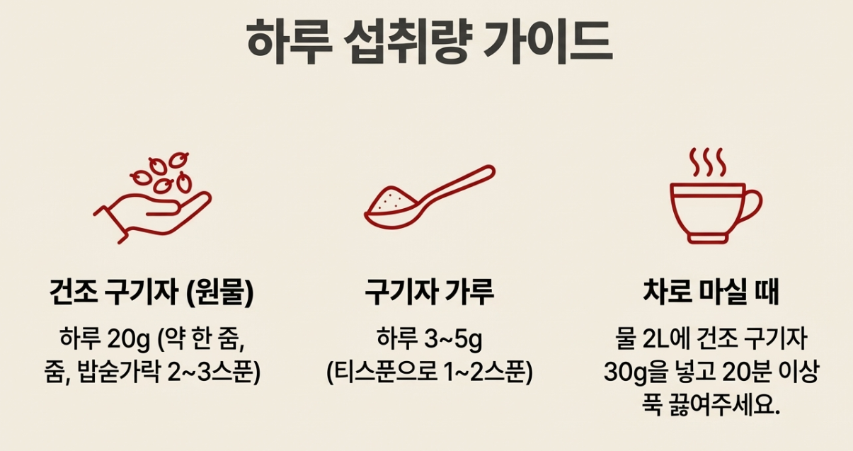 - 구기자 가루: 하루 3~5g (티스푼으로 1~2스푼)