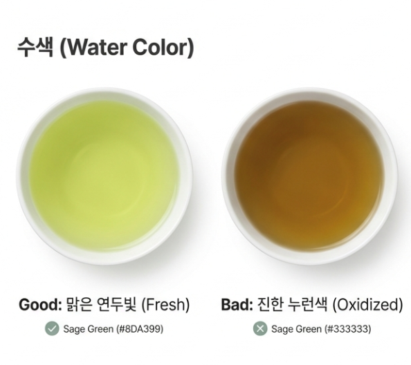 우렸을 때 탁하지 않고 맑은 연두빛을 띠는 것이 신선한 녹차입니다. 누런색이 너무 진하다면 산화되었을 가능성이 있어요.
