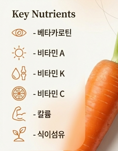 - 눈 건강의 수호자: 당근의 베타카로틴은 비타민 A로 전환되어 야맹증 예방 및 시력 보호에 탁월합니다.