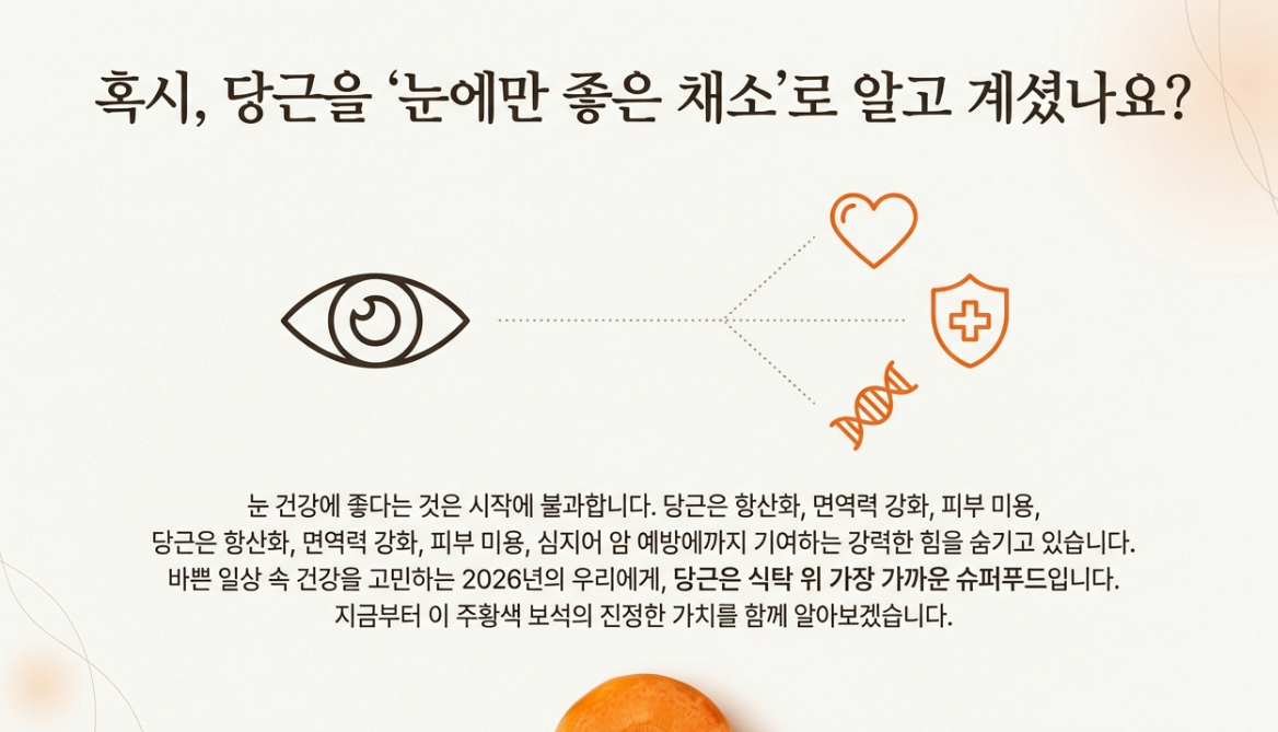 주황색 채소의 대명사, 당근! 단순히 눈에만 좋다고 생각하셨나요? 2026년, 당근의 숨겨진 놀라운 효능부터 맛있게 즐기는 방법, 그리고 현명한 섭취 팁까지 모두 알려드립니다. 이 글을 통해 당근의 진정한 가치를 발견하고, 건강한 식습관을 시작해보세요!