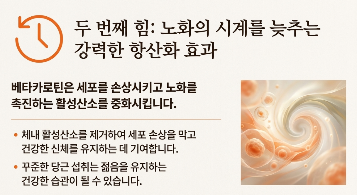 베타카로틴은 강력한 항산화제이기도 합니다. 체내 활성산소는 세포를 손상시키고 노화를 촉진하는데, 베타카로틴은 이러한 활성산소를 중화시켜 세포 손상을 막고 노화를 늦추는 데 도움을 줍니다. 꾸준한 당근 섭취는 젊고 건강한 신체를 유지하는 데 기여할 수 있습니다.