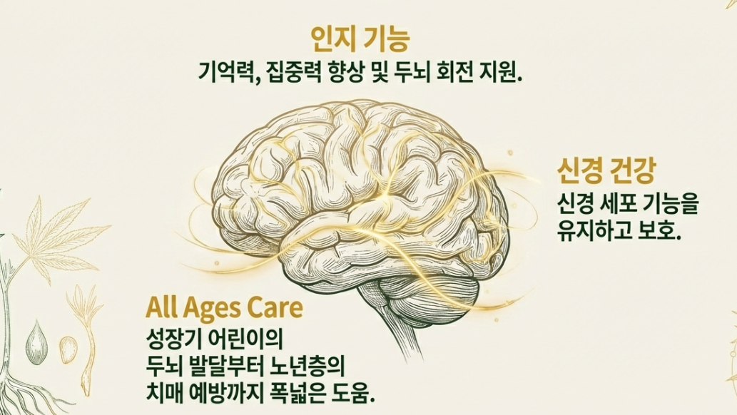 오메가 지방산은 두뇌의 주요 구성 요소이자 신경 세포 기능에 필수적인 영양소입니다. 대마 종자유의 오메가 지방산은 기억력, 집중력 등 인지 기능 향상에 도움을 줄 수 있으며, 신경계 건강을 유지하는 데 중요한 역할을 합니다. 성장기 어린이부터 노년층까지 모두에게 유익하겠죠?