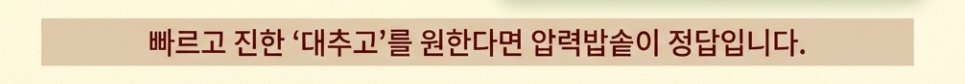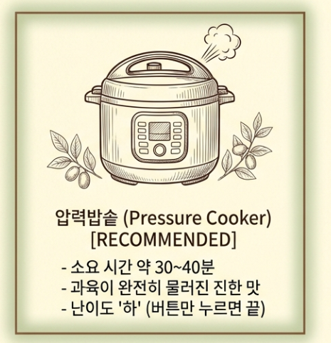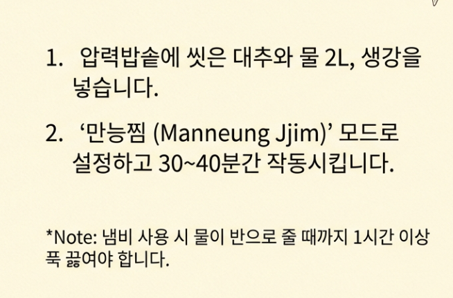 - 익히기: 압력밥솥에 대추와 물 2L, 생강을 넣고 '만능찜' 모드로 30~40분 돌립니다. (냄비라면 물이 반으로 줄 때까지 1시간 이상 푹 끓이세요.)