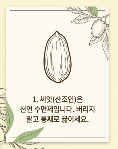 오히려 대추씨(산조인)에는 불면증을 완화하는 핵심 성분이 들어있어요. 독성이 없으니 안심하고 통째로 푹 끓인 뒤, 나중에 걸러내는 것이 훨씬 좋습니다.