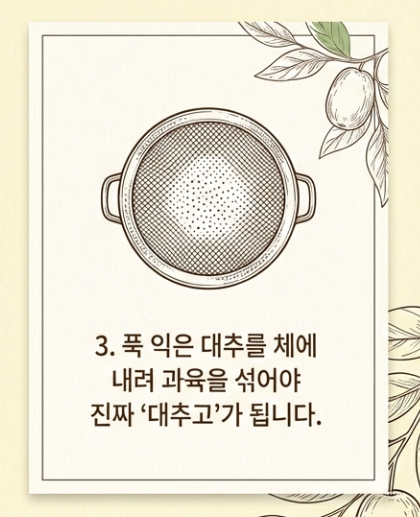 - 으깨기 (핵심!): 대추가 흐물흐물해지면 체에 밭쳐 으깨주세요. 껍질과 씨만 남기고 과육을 전부 국물로 내려야 걸쭉하고 진한 맛이 납니다.