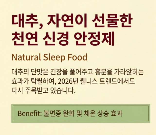 대추는 예로부터 '천연 신경 안정제'라고 불렸어요. 특히 대추의 단맛은 긴장을 풀어주고 흥분을 가라앉히는 효과가 탁월하죠. 2026년 웰니스 트렌드에서도 '내추럴 슬립 푸드'로 대추가 다시 주목받고 있다는 사실, 알고 계셨나요?