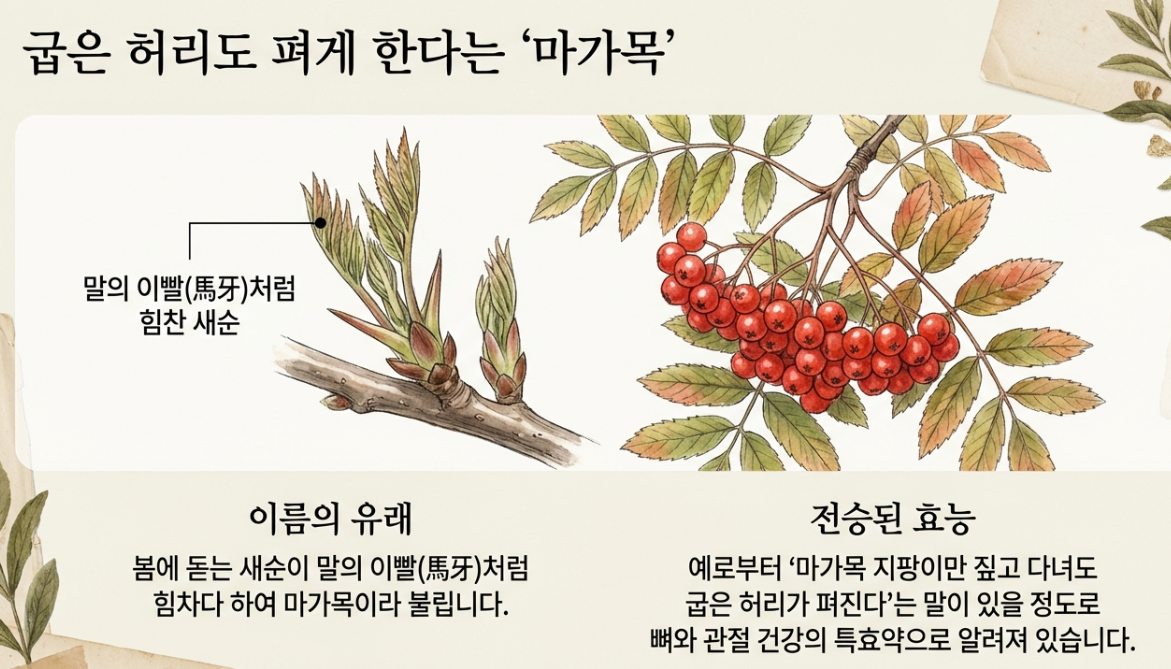 마가목(Sorbus commixta)은 봄에는 말의 이빨처럼 힘찬 새순이 돋고, 가을에는 콩알만한 붉은 열매가 주렁주렁 달리는 나무입니다. 예로부터 "마가목 지팡이만 짚고 다녀도 굽은 허리가 펴진다"라는 말이 있을 정도로 뼈와 관절 건강에 특효약으로 알려져 왔어요.