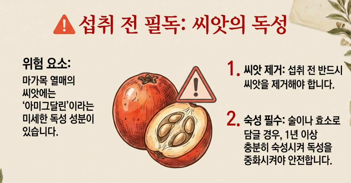 마가목 열매의 씨앗에는 '아미그달린'이라는 미세한 독성 성분이 있습니다. 반드시 씨앗을 제거하거나, 효소/술로 담글 때 1년 이상 충분히 숙성시켜 독성을 중화시켜야 안전합니다.