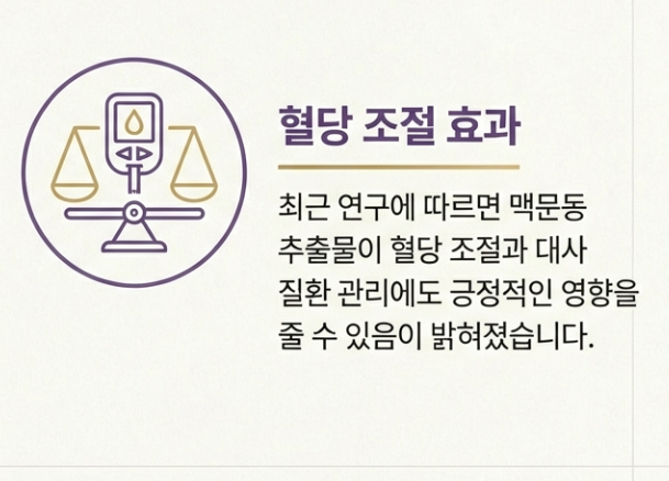 최근 연구에 따르면 맥문동 추출물이 혈당 조절에도 긍정적인 영향을 줄 수 있다는 결과가 나오고 있어요. 단순한 기관지 약재를 넘어 대사 질환 관리에도 주목받고 있답니다.