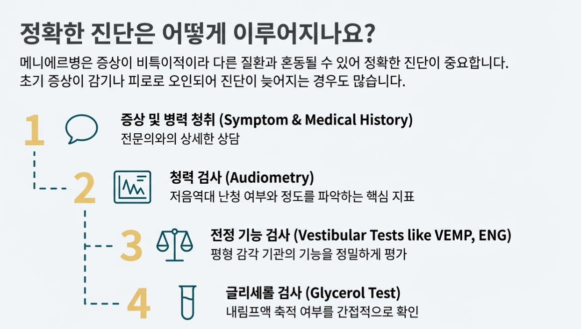 메니에르병은 증상이 비특이적이고 다른 질환과 혼동될 수 있어 정확한 진단이 중요합니다. 이비인후과 전문의는 환자의 증상 이력 청취 후 다양한 검사를 통해 진단하게 됩니다. 제가 경험한 바로는, 초기 증상이 감기나 피로로 오인되어 진단이 늦어지는 경우가 많았어요.