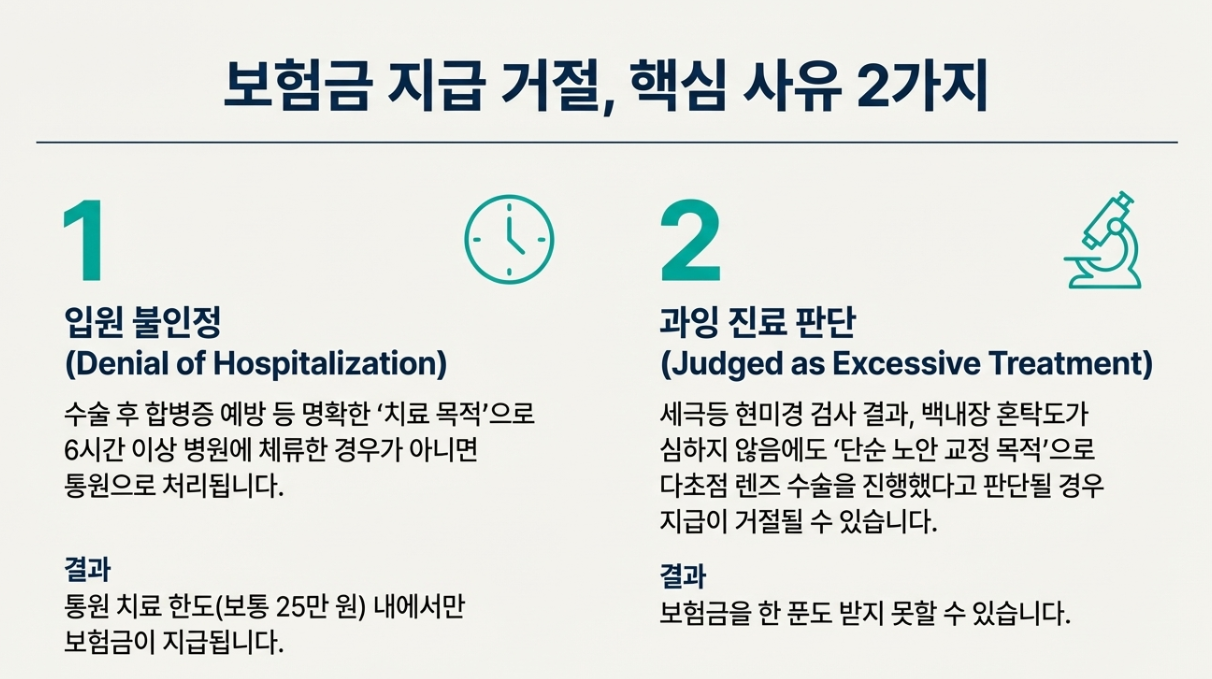 → 즉, "단순 노안 교정 목적"으로 다초점 렌즈 수술을 하면 보험금을 한 푼도 못 받을 수도 있습니다.