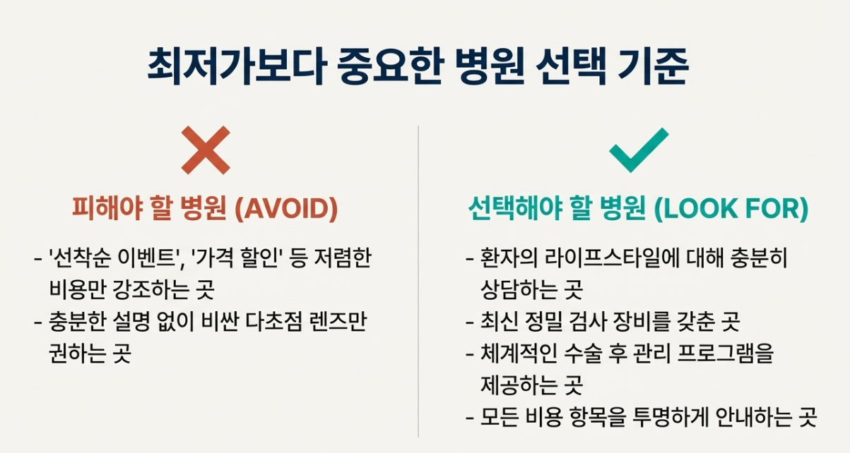 '최신 렌즈가 무조건 좋다'며 비싼 다초점 렌즈를 권하는 병원도 있습니다. 하지만 야간 운전을 많이 하시거나 예민하신 분들은 빛 번짐 부작용 때문에 오히려 단초점 렌즈가 더 적합할 수 있어요. 꼭 라이프스타일에 맞춰 상담받으세요!