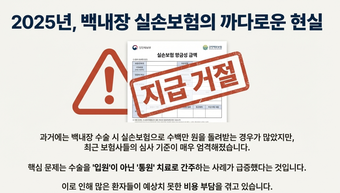 - 입원 인정 불가: 수술 후 6시간 이상 병원에 머물렀어도, 합병증 등 치료 목적이 명확하지 않으면 '통원'으로 간주하여 통원 한도(보통 25만 원)만 지급하는 사례 급증.