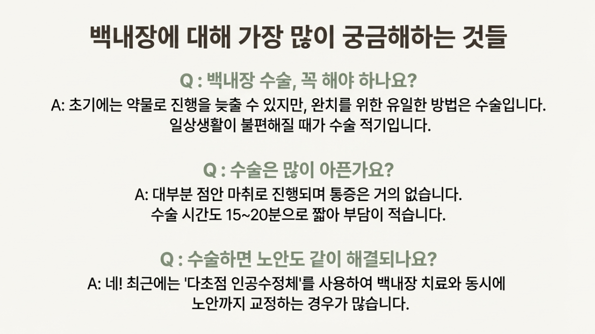백내장은 치료 시기를 놓치면 수술이 까다로워질 뿐만 아니라, 녹내장 같은 합병증을 유발할 수 있어요. 초기 증상을 놓치지 않는 것이 무엇보다 중요합니다.