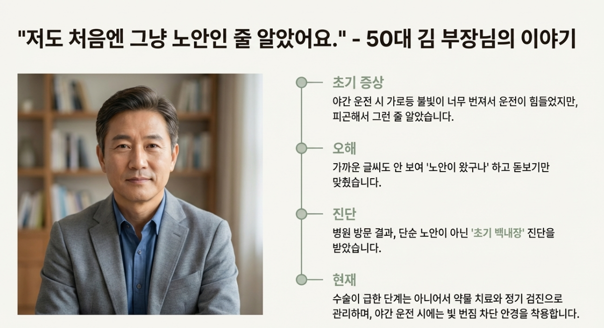 - 초기 증상: 야간 운전 시 가로등 불빛이 너무 번져서 운전이 힘들었다고 해요. 처음엔 피곤해서 그런가 보다 생각했죠.