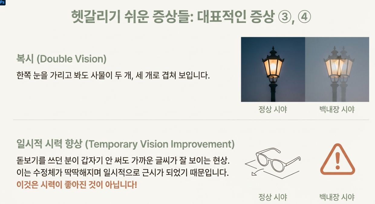 - 일시적 시력 향상: 돋보기를 쓰던 분이 갑자기 돋보기 없이도 글씨가 잘 보이는 경우가 있는데, 이는 수정체가 딱딱해지면서 일시적으로 근시가 되었기 때문이에요. (좋아진 게 아니랍니다!)