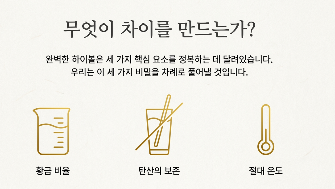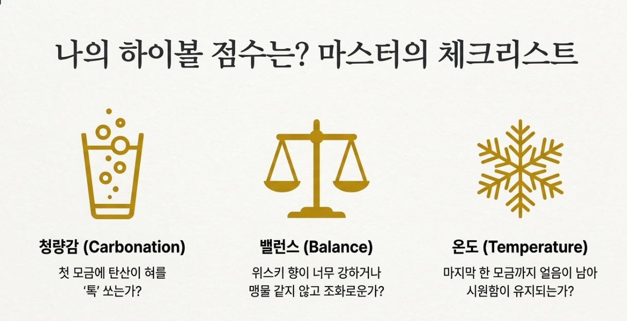 직접 만든 하이볼이 완벽한지 확인하고 싶으신가요? 아래 3가지 포인트를 체크해보세요. (계산기 대신 여러분의 혀끝 감각을 믿어보세요!)