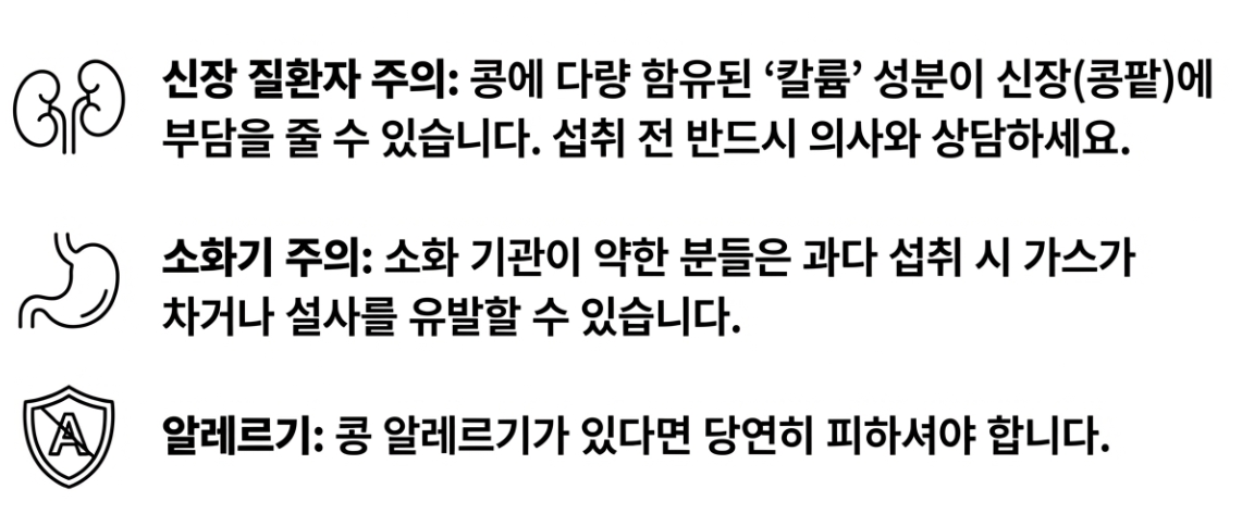 신장(콩팥)이 좋지 않은 분들은 콩에 들어있는 칼륨 성분이 부담될 수 있으니 섭취 전 의사와 상담하는 것이 안전해요. 또한, 콩 알레르기가 있다면 당연히 피하셔야겠죠?