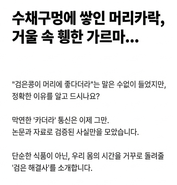 가장 궁금해하시는 부분이죠. 결론부터 말씀드리면, 서리태는 대머리 치료제는 아니지만 '모발을 붙잡아두는 힘'을 키워주는 데는 확실한 효과가 있습니다.