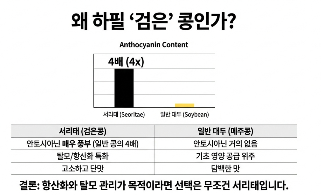 서리태의 껍질에는 항산화 성분인 '안토시아닌'이 알맹이보다 훨씬 많아요. 탈모 예방 효과를 제대로 보려면 반드시 껍질째 드셔야 해요!