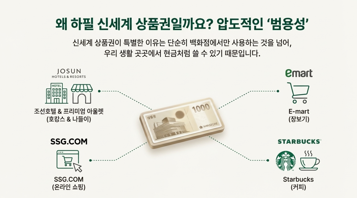 우리나라에는 수많은 백화점이 있지만, 신세계 상품권이 특히 인기 있는 이유는 압도적인 '범용성' 때문이에요. 단순히 백화점에서만 쓰는 게 아니거든요.