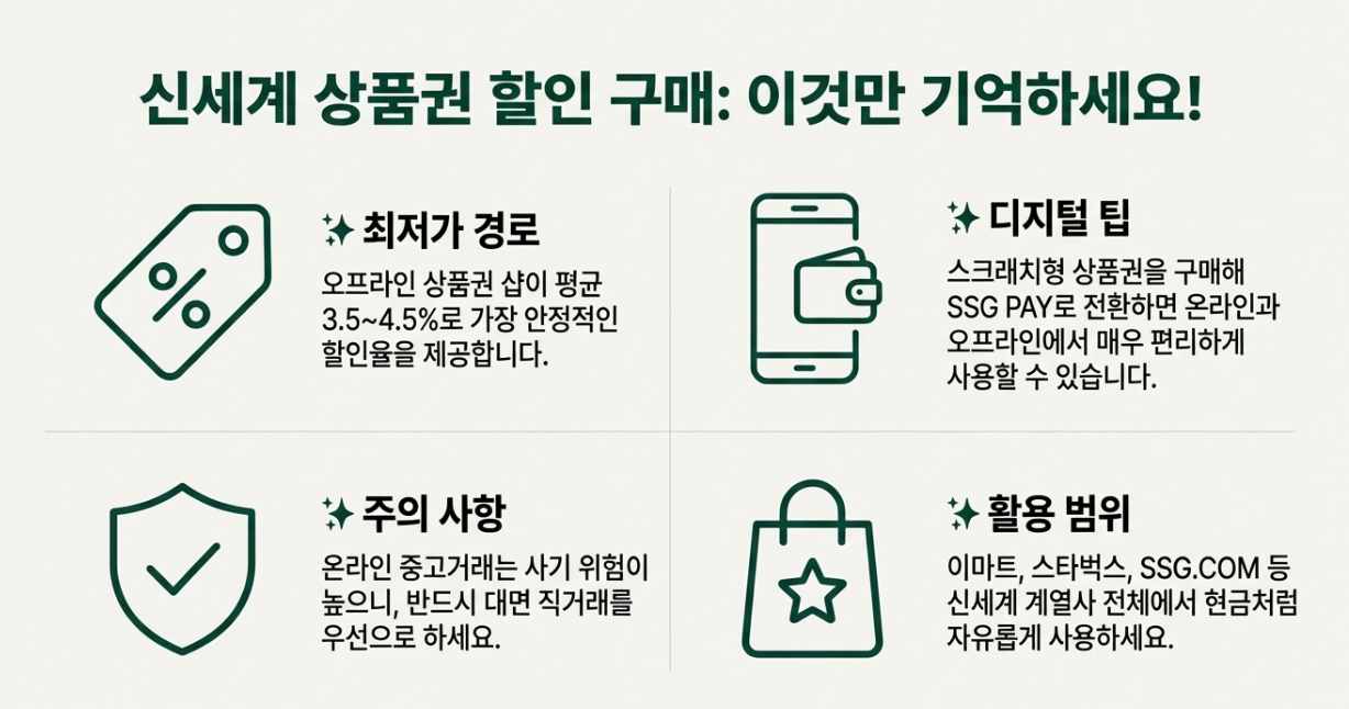 ✅ 디지털 전환의 속도: 최근에는 종이 상품권보다 모바일 기프티콘 형태가 더 자주 할인 딜로 뜹니다. 이를 쓱페이(SSG PAY)로 전환하면 온라인 결제 시 추가 적립까지 챙길 수 있죠.