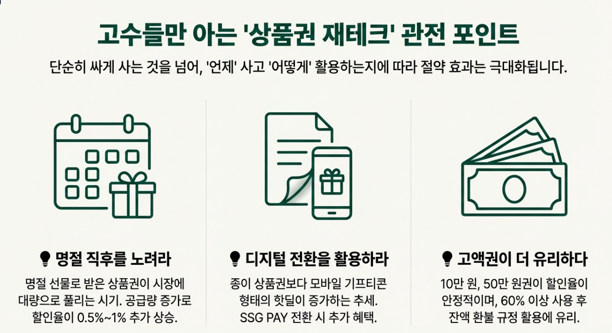 ✅ 명절 직후를 노려라: 명절 선물로 받은 상품권이 대거 시장에 풀리는 시기입니다. 공급이 많으니 할인율이 평소보다 0.5%~1% 정도 더 높아지는 마법을 볼 수 있어요.