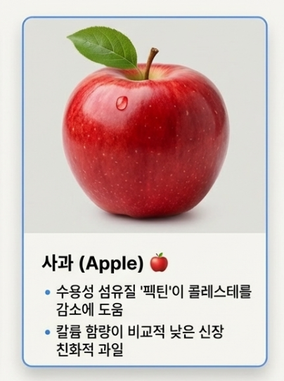사과는 펙틴이라는 수용성 섬유질이 풍부하여 혈중 콜레스테롤과 혈당 수치를 낮추는 데 도움을 줍니다. 또한, 항산화 물질이 풍부하고 칼륨 함량도 비교적 낮아 신장 친화적인 과일입니다.