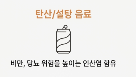 | 탄산음료, 설탕 함유 음료 | 인산염 함유, 비만 및 당뇨 위험 증가 |