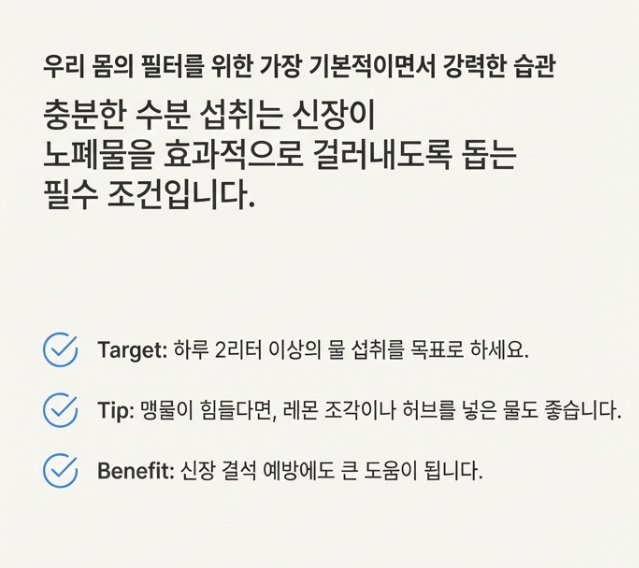 - ✔️ 충분한 수분 섭취와 규칙적인 생활 습관은 신장 건강 유지의 필수입니다.