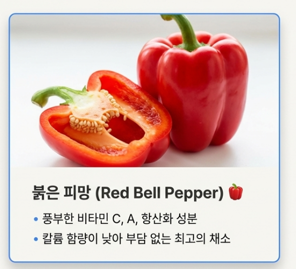 붉은 피망은 비타민 C, 비타민 A, 엽산, 섬유질이 풍부하며, 항산화 성분인 라이코펜을 함유하고 있습니다. 칼륨 함량이 낮아 신장 기능이 저하된 분들에게도 안전한 채소입니다. 생으로 먹거나 볶음 요리에 활용하면 좋아요.
