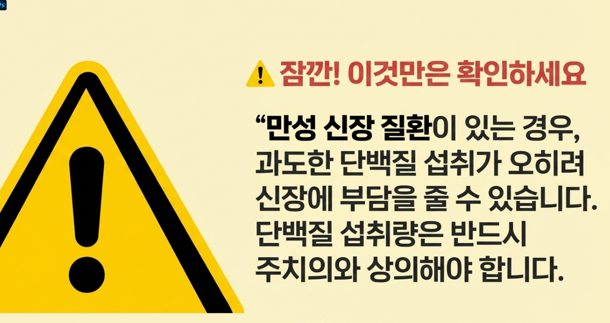 단백질이 좋다고 해서 무조건 많이 드시면 안 되는 분들이 있어요. 만성 신장 질환이 있는 경우, 과도한 단백질 섭취가 오히려 신장에 부담을 줄 수 있습니다. 이런 분들은 반드시 주치의와 상의 후 섭취량을 조절하셔야 해요!
