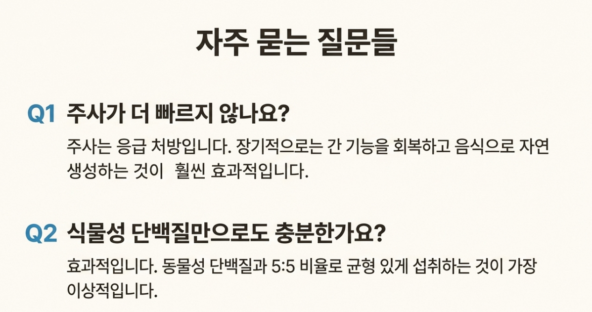 알부민은 100% 간에서 만들어집니다. 아무리 좋은 단백질을 먹어도 공장(간)이 과로 중이라면 생산이 안 되겠죠? 금주와 충분한 수면은 필수입니다.