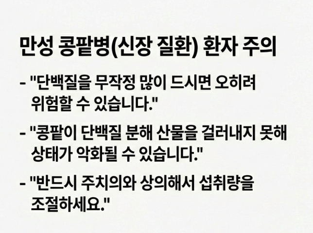 단, 신장 질환(만성 콩팥병)이 있는 분들은 단백질을 무작정 많이 드시면 오히려 위험할 수 있어요. 이 경우엔 반드시 주치의와 상의해서 섭취량을 조절해야 합니다.