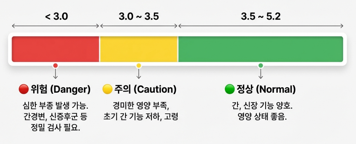 | 주의 (경계) | 3.0 ~ 3.5 | 경미한 영양 부족, 초기 간 기능 저하, 고령. |