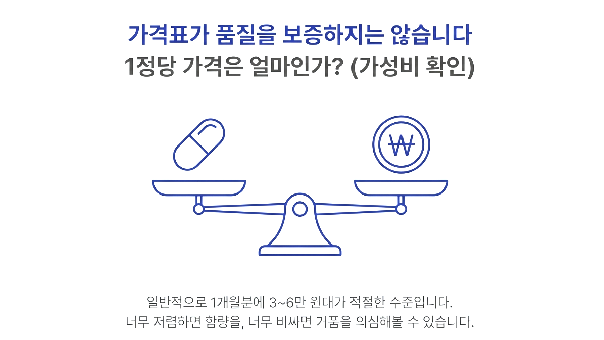 비싸다고 무조건 좋은 건 아니에요. 1정당 알부민 단가를 계산해 보세요. 보통 1개월분에 3~6만 원대가 적당한 수준이에요. 너무 저렴하면 함량이 의심스럽고, 너무 비싸면 거품일 수 있어요.