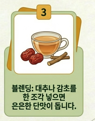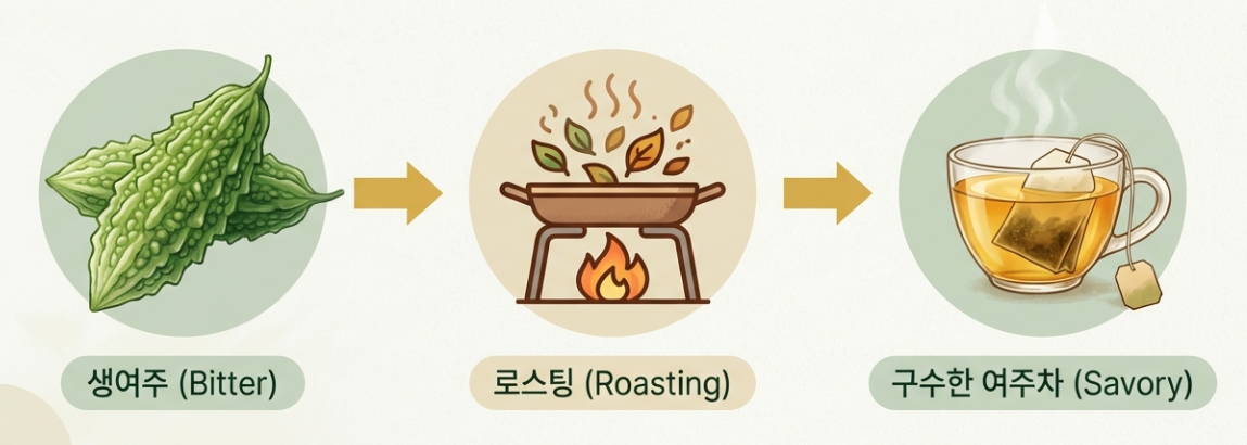 | 건여주(차) | 구수한 맛(쓴맛 중화), 보관 용이 | 우려내는 시간 필요 |