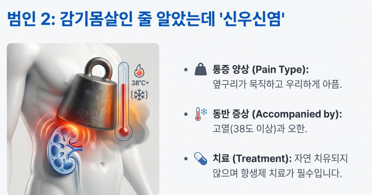 | 신우신염 | 옆구리가 묵직하게 아프면서 고열과 오한이 동반됨. 감기몸살로 착각하기 쉬움. | 항생제 치료 필수 |