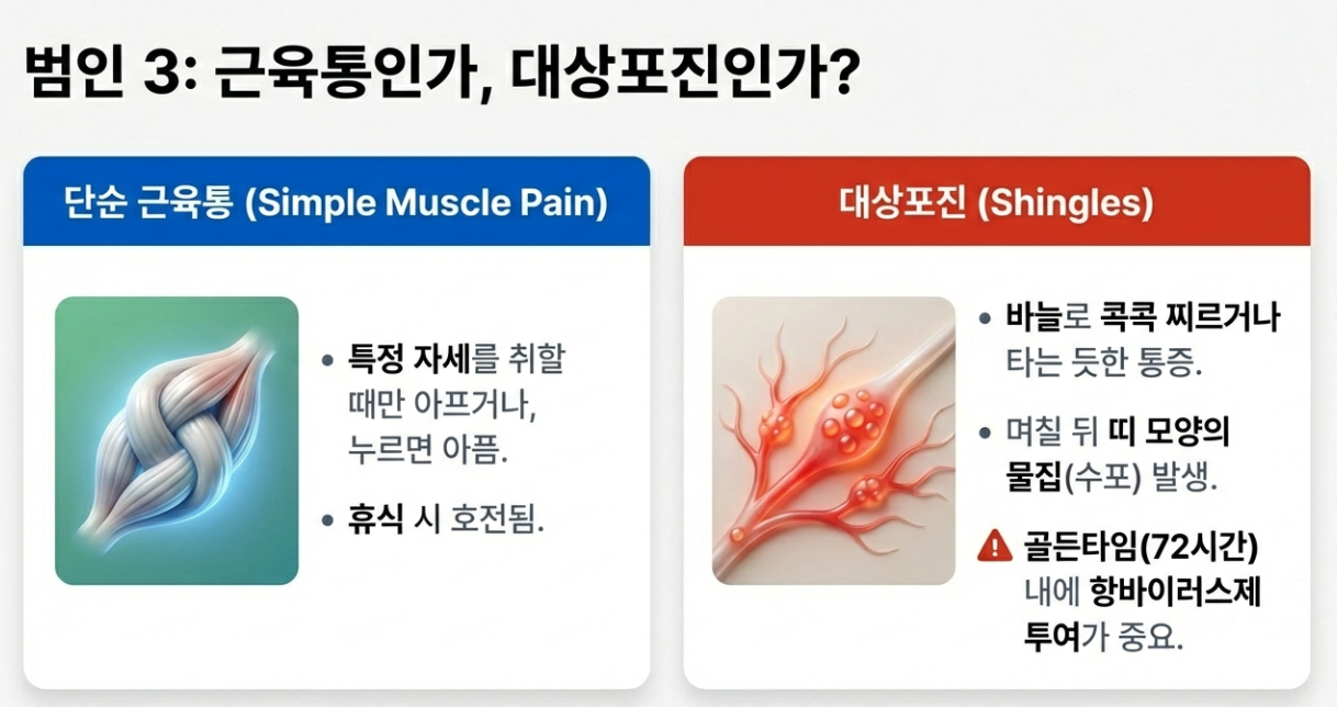| 대상포진 | 바늘로 콕콕 찌르거나 타는 듯한 통증. 며칠 뒤 띠 모양의 물집(수포) 발생. | 골든타임(72시간) 중요 |