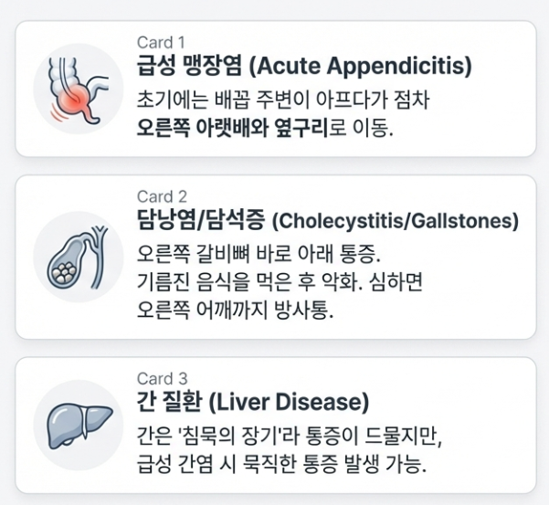 - 담낭염/담석증: 오른쪽 갈비뼈 바로 아래가 아프고, 심하면 오른쪽 어깨까지 통증이 퍼질 수 있습니다. 기름진 음식을 먹고 나서 더 아프다면 의심해보세요.