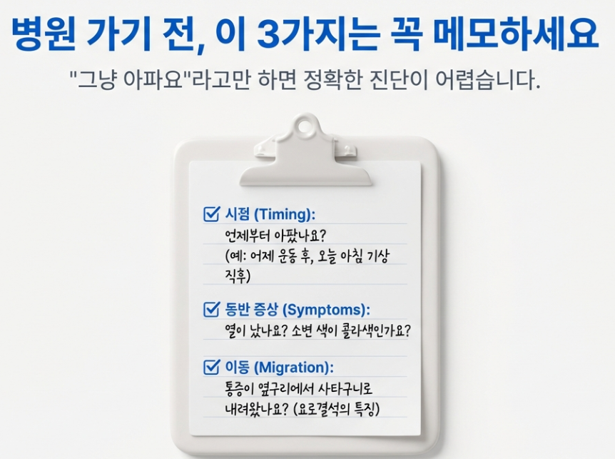 병원에 가서 의사 선생님께 증상을 설명할 때, "그냥 옆구리가 아파요"라고만 하면 정확한 진단이 어려울 수 있습니다. 다음 3가지 포인트를 미리 메모해서 가시면 진료에 큰 도움이 됩니다.