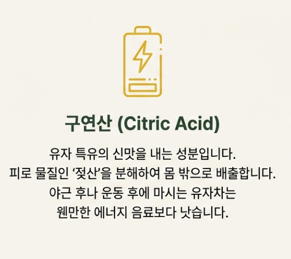 유자 특유의 신맛을 내는 '구연산'은 피로 물질인 젖산을 분해해서 몸 밖으로 배출해 줘요. 야근하고 돌아온 저녁이나, 운동 후에 마시는 시원한 유자차 한 잔은 웬만한 에너지 음료보다 나을 수 있답니다.