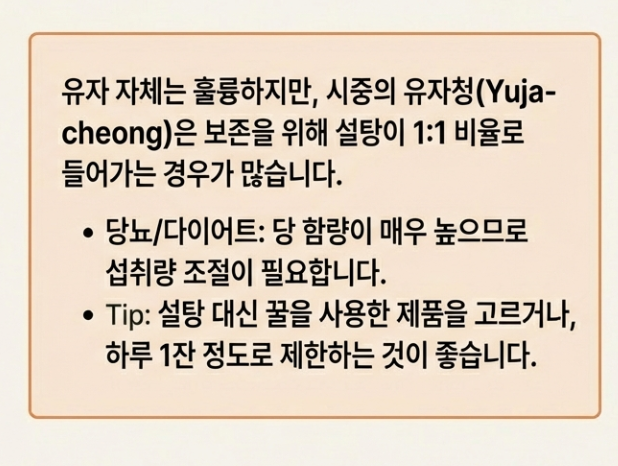 유자는 그 자체로 훌륭하지만, 시중에 파는 유자청은 설탕 함량이 매우 높을 수 있어요 (보통 1:1 비율).
