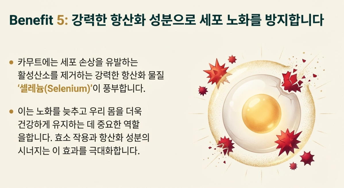 카무트에는 셀레늄과 같은 강력한 항산화 물질이 풍부합니다. 셀레늄은 세포 손상을 유발하는 활성산소를 제거하고, 노화를 늦추는 데 중요한 역할을 해요. 효소 작용과 함께 카무트의 항산화 성분을 섭취하면 우리 몸을 더욱 건강하게 유지하는 데 시너지를 얻을 수 있습니다.