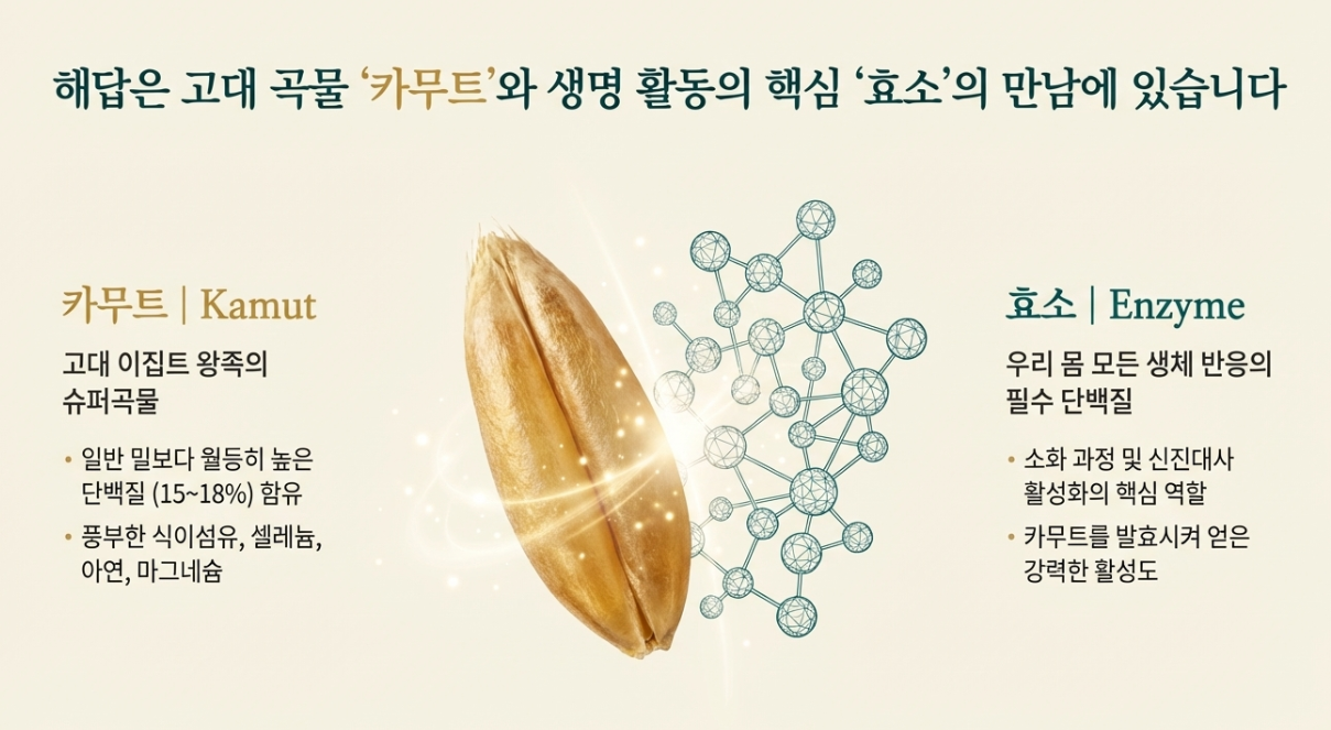 카무트(Kamut)는 고대 이집트에서부터 재배되어온 곡물로, 일반 밀보다 더 큰 알갱이와 풍부한 영양소를 자랑합니다. 특히 단백질, 식이섬유, 셀레늄, 아연, 마그네슘 등이 풍부하게 함유되어 있어 '슈퍼곡물'로 불리기도 하죠. 그런데 이런 카무트가 '효소'와 만나면서 그 시너지가 더욱 주목받고 있습니다.