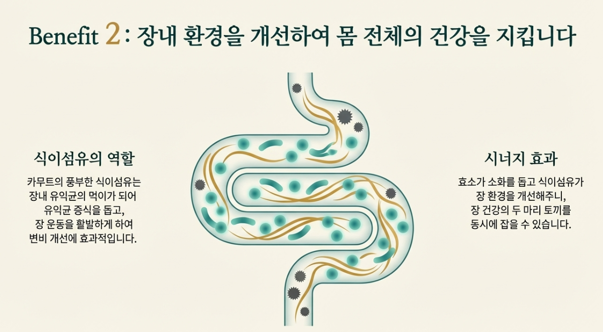 카무트는 풍부한 식이섬유를 포함하고 있습니다. 이 식이섬유는 장내 유익균의 먹이가 되어 유익균 증식을 돕고, 장 운동을 활발하게 하여 변비 개선에 효과적이에요. 효소가 소화를 돕고 식이섬유가 장 환경을 개선해주니, 장 건강의 두 마리 토끼를 동시에 잡을 수 있는 거죠. 건강한 장은 곧 건강한 몸의 시작이랍니다!