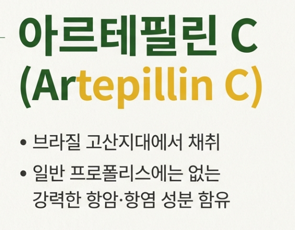 최근에는 브라질의 고산지대에서 채취한 '그린 프로폴리스'가 주목받고 있습니다. 일반 프로폴리스에는 없는 '아르테필린 C'라는 강력한 항암·항염 성분이 추가로 함유되어 있기 때문이에요.